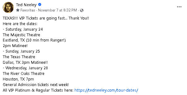 UPDATE 1/3/24 (From Ted Neeley.com and Ted's Facebook Page)