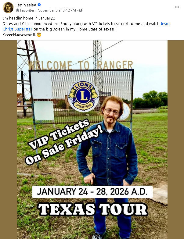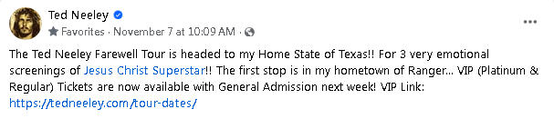 UPDATE: 10/19/19 (From Ted Neeley's Facebook Page and HERE)